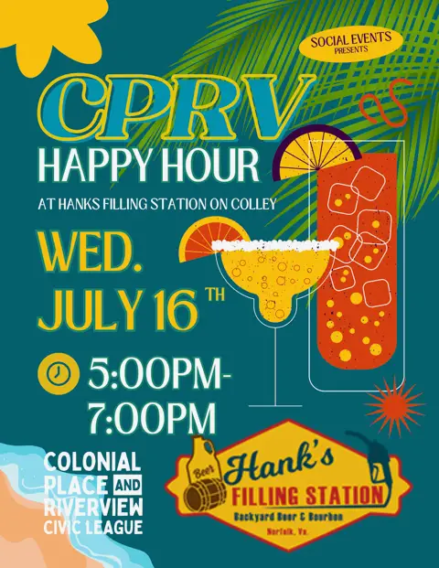 Mark your calendars, neighbors! The Colonial Place & Riverview Civic League is taking over Hank’s Filling Station (4301 Colley Ave.) for a midsummer Happy Hour on Wednesday, July 16, from 5:00 – 7:00 p.m.