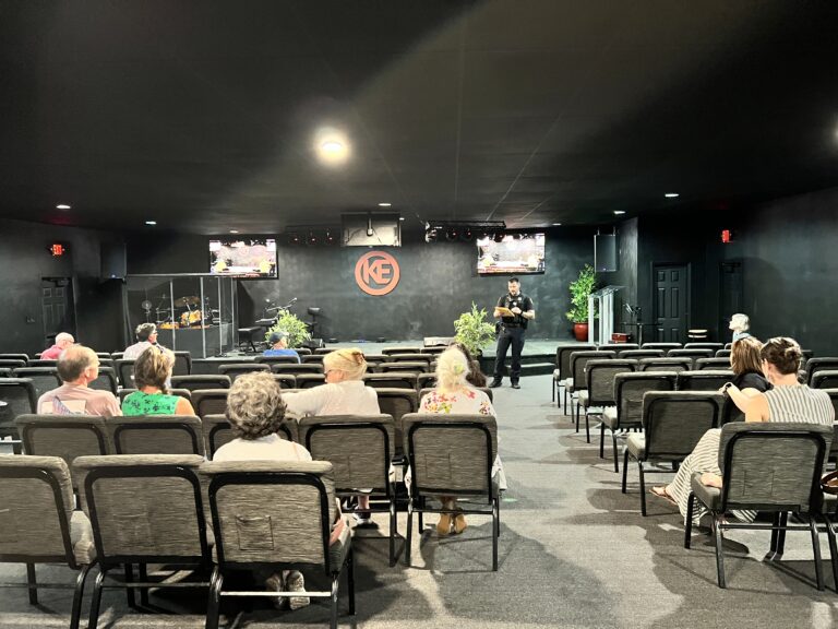 Community Resource Officer sharing the crime report with attending members.