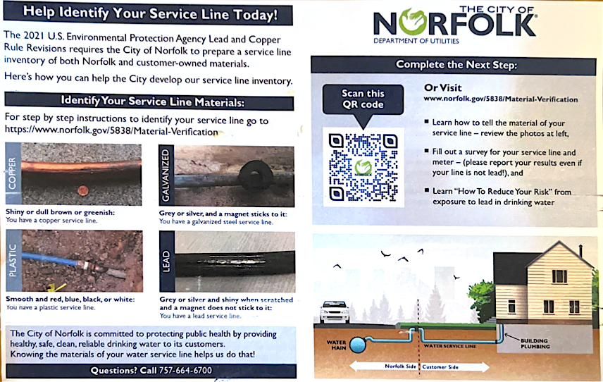 The 2021 U.S. Environmental Protection Agency Lead and Copper Rule Revisions requires the City of Norfolk to prepare a service line inventory of both Norfolk and customer-owned materials.